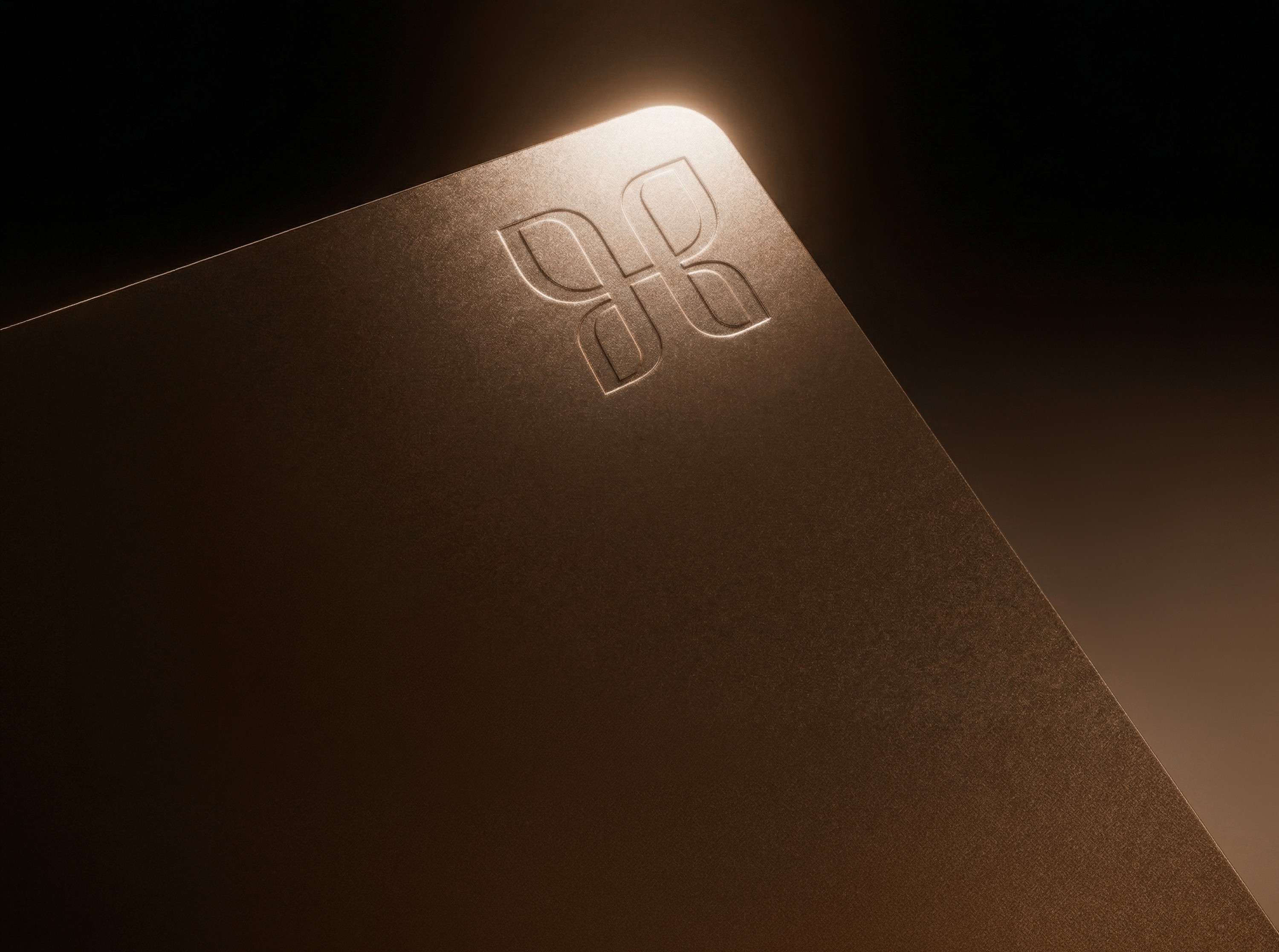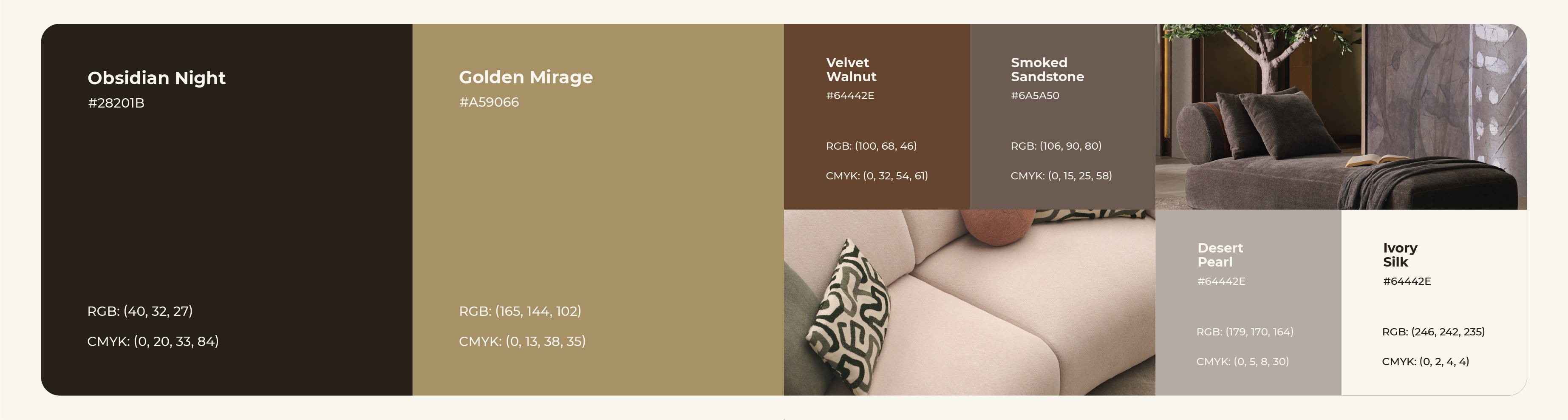Supporting this mark is a carefully curated visual language inspired by the textures and tones of luxury interiors. A palette of deep neutrals and warm metallic gold establishes a sense of permanence and prestige, while the typography introduces a balance of authority and artistry.
