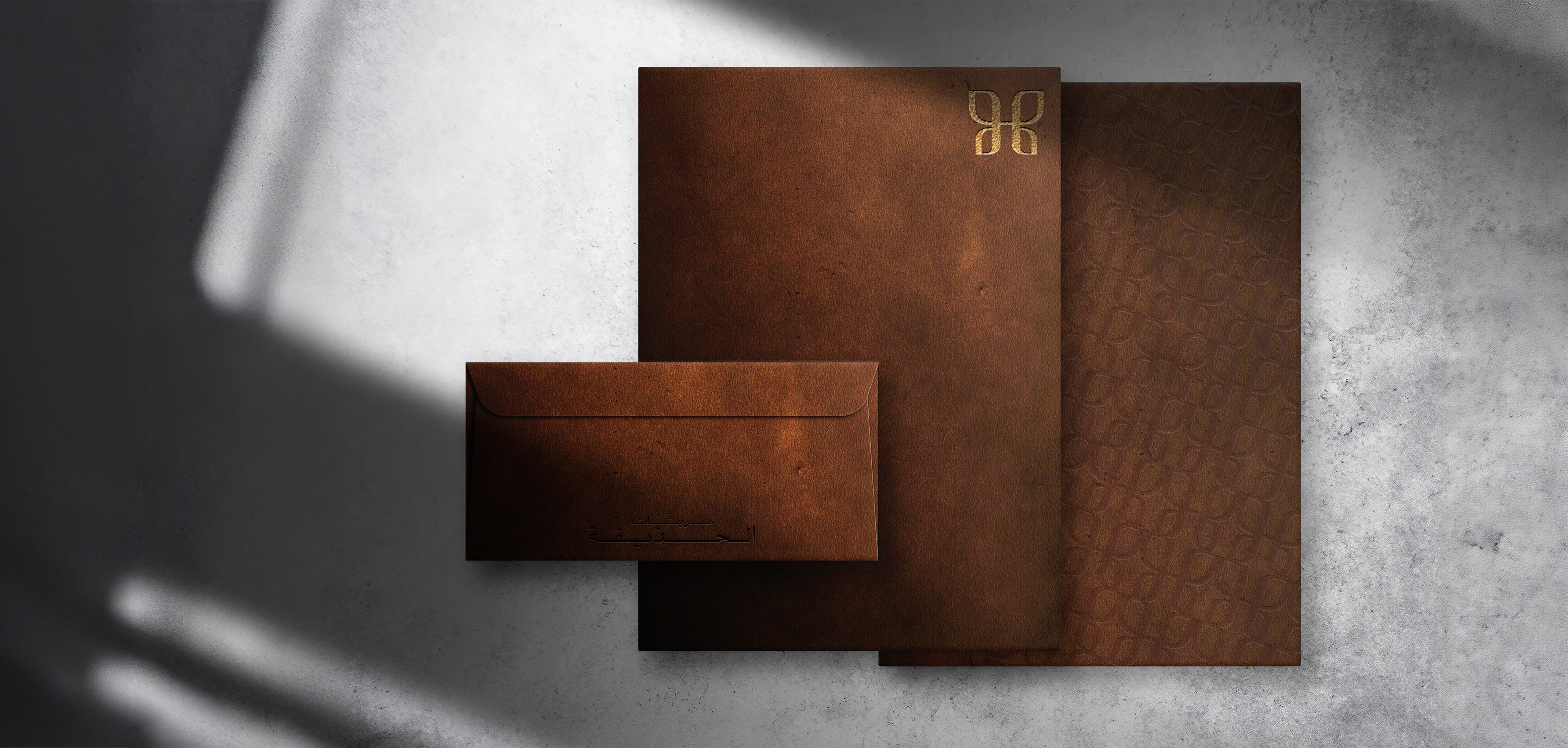 The identity system is built around the Al Huzaifa monogram, a butterfly form constructed through symmetrical geometry and refined proportion. Within the silhouette, the letter “H” emerges subtly through negative space, anchoring the mark to the brand while maintaining visual harmony.